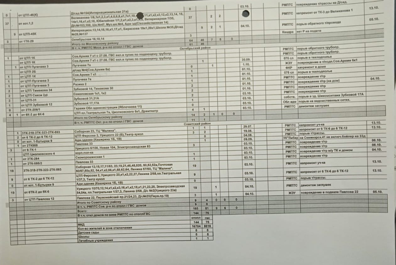 05.10.2025 По состоянию на 6 утра 5 октября имеются отключения. Наши бригады в оперативном режиме устраняют повреждения на теплосетях, выявленные при пуске отопления